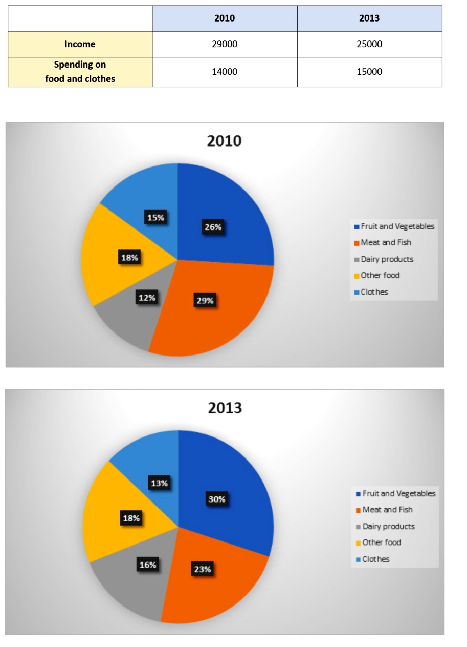 The table illustrates how much money an average family in a UK city earned and paid for food and clothes, while the pie charts represent the proportion of spending on those categories in 2010 and 2013.