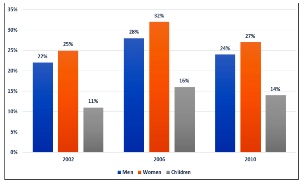 In all three years, there was a small difference in the percentage of males and females who consumed enough fruit and vegetables every day. The highest figure for women was 32% in 2006 compared to 28% of men. 2010 witnessed the second highest rank for both women and men’s figures. While 27% of women consumed fruit and vegetables, the percentage of men was 24%. And the smallest figure for both women and men, which was nearly the same as the 2010 figures, was recorded in 2002.
