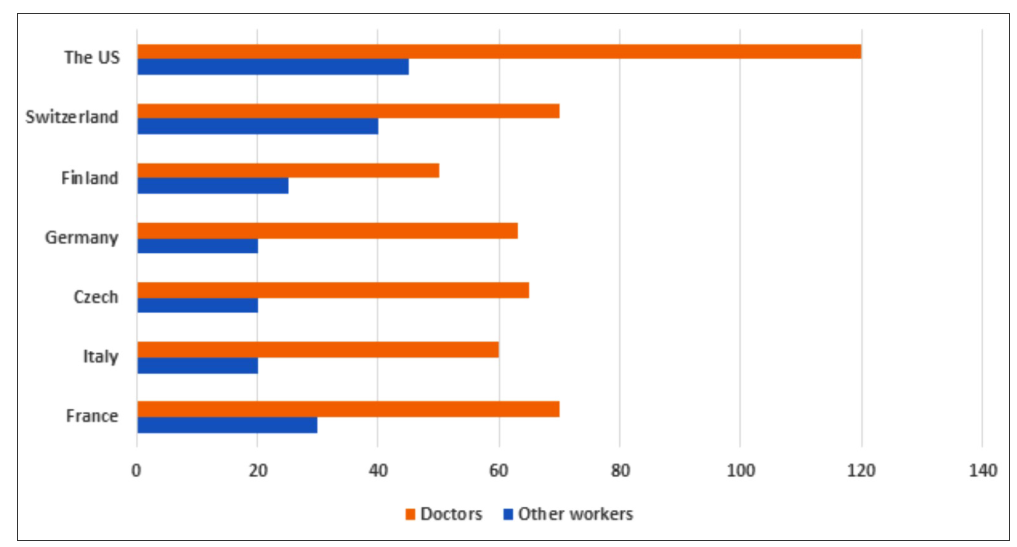 The US doctors earned the largest amount of money compared to those in the other six countries, receiving nearly $120,000, while the figures for Switzerland and France were significantly lower, at close to 70,000 each. In contrast, there was only about $50,000 earned by doctors in Finland, as opposed to doctors in the other countries, who received around $61,000 each.